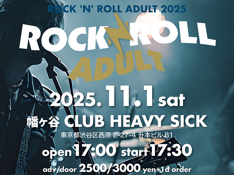 ROCK 'N' ROLL ADULT 2025 ■2025.11.1 sat ■幡ヶ谷 CLUB HEAVY SICK ■open17:00 start17:30 ■adv/door 2500/3000 yen+1d order ★Timetable★ ① 17:30〜 The Wizard’s Blue Bird ② 18:10〜 原興業2025 ③ 18:50〜 エマ・ケイシー ④ 19:30〜 COMBAT5 ⑤ 20:10〜 黒鯖寿司 ⑥ 20:50〜 ROBBIE THUNDER DJ Patch